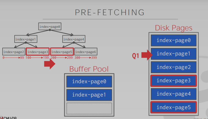 select * from t where v between 100 and 250,操作系统会在读到page0时,预读取page 0 1 2,这是合理的,然而在读到page3时,预读取page 3 4 5,因为这就很冗余,我们只需要page 3 和 5。本质上是操作系统不理解我们基于树的存储方式,而数据库系统可以做到。当然,具体怎么实现恐怕各个存储引擎都有各自的方式,这们课对此也仅仅是提了一嘴。